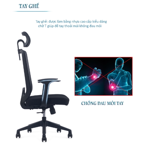 Tay ghế– Tay ghế được làm bằng nhựa, thiết kế hình chữ T cách điệu mang lại tính hiện đại và thẩm mỹ cho không gian làm việc