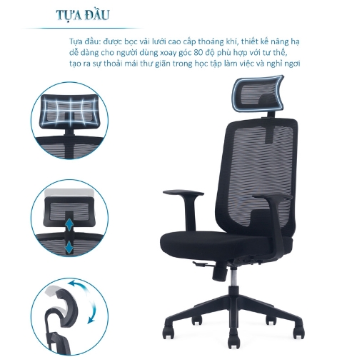 • Tựa Đầu Điều Chỉnh Đa Hướng: Ghế được trang bị tựa đầu lưới dày dặn, có khả năng điều chỉnh cao thấp và góc nghiêng linh hoạt. Tính năng này giúp chiếc ghế lưới văn phòng này nâng đỡ hoàn hảo vùng cổ và vai gáy, giảm căng thẳng tối đa, đặc biệt khi bạn ngả lưng thư giãn.