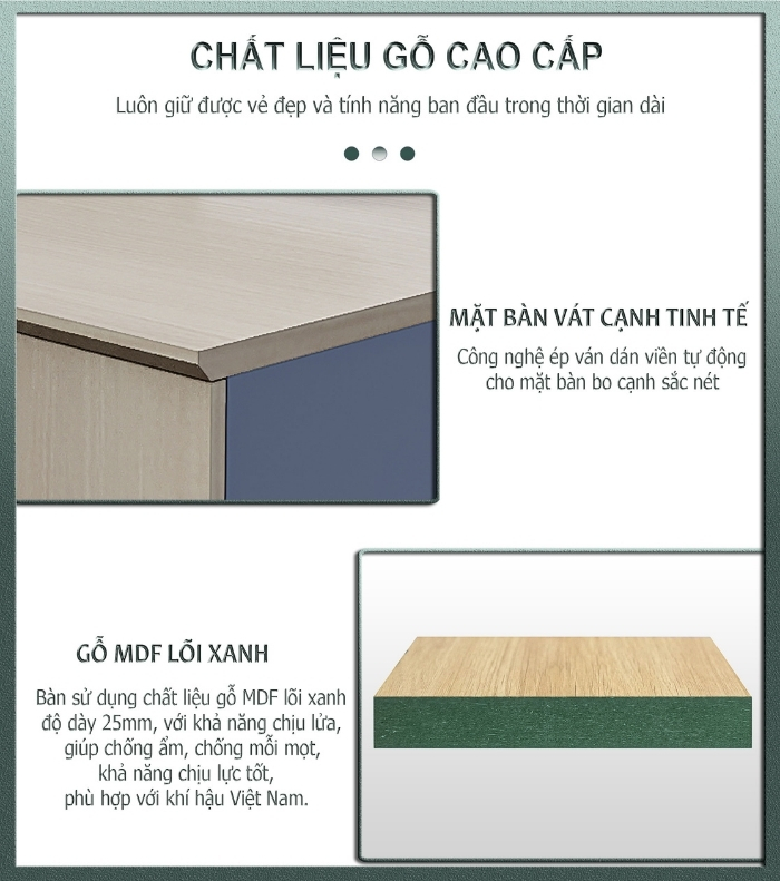 • Mặt bàn gỗ công nghiệp lõi xanh phủ Melamine chống cháy, chống xước, chống thấm nhẹ, cạnh vát tinh tế, dán viền tự động sắc nét.