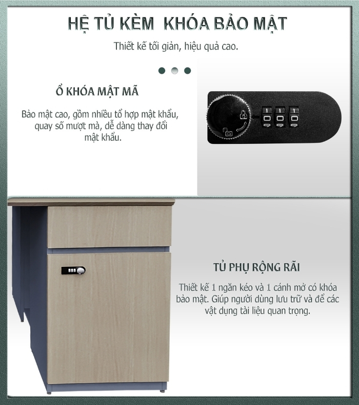 • Hộc Tủ Khóa Mật Mã: Hộc tủ tài liệu rộng rãi (1 ngăn kéo + 1 ngăn cánh mở) được trang bị khóa mật mã bảo mật cao, đảm bảo an toàn tuyệt đối cho hồ sơ quan trọng.