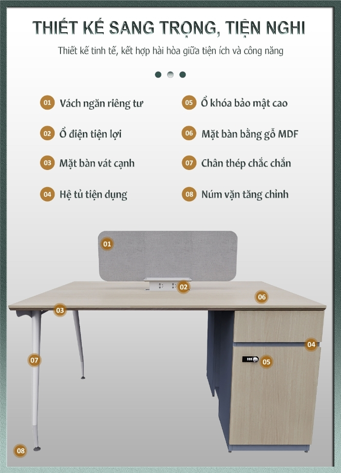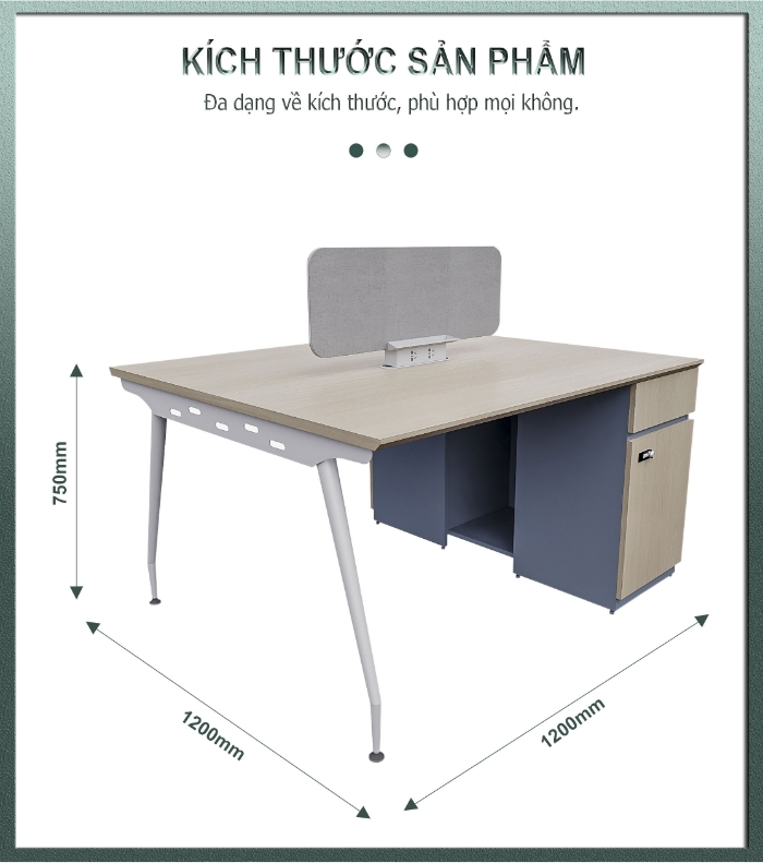 Thiết kế Nổi bật– Thiết kế hiện đại, tối ưu diện tích văn phòng. Vách ngăn bọc vải nỉ tạo sự riêng tư và tăng tính chuyên nghiệp. Ổ điện đa năng tích hợp ngay dưới vách ngăn.