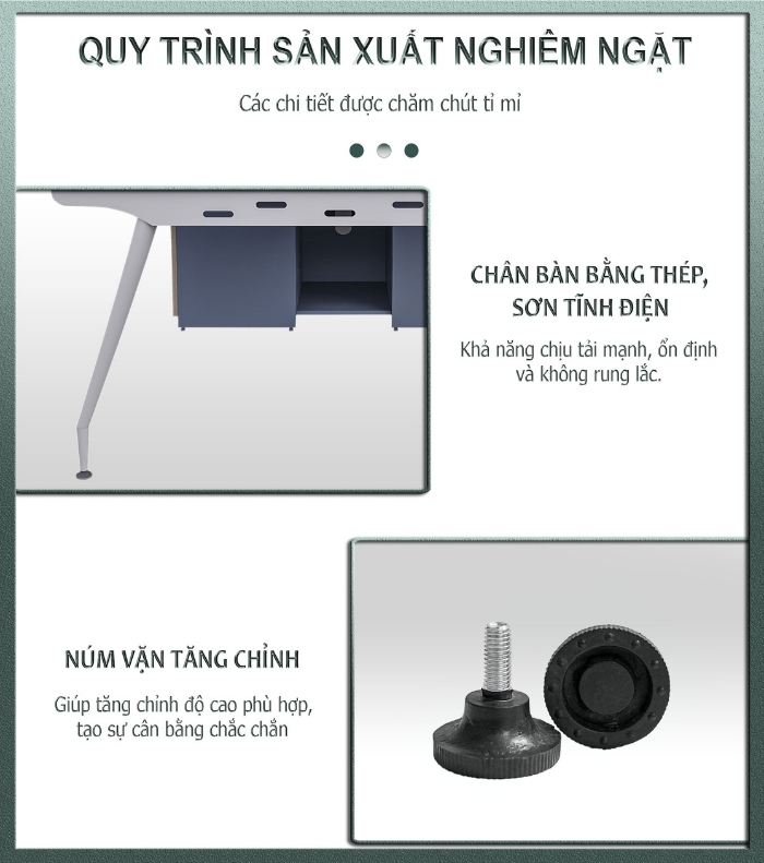 • Chân bàn thép sơn tĩnh điện, có núm vặn tăng chỉnh linh hoạt. Kiểu dáng tối giản, hiện đại, dễ dàng phù hợp với nhiều không gian văn phòng.