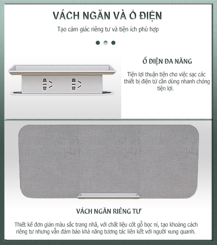 • Ổ Điện Đa Năng: Ổ điện đa năng tích hợp ngay dưới vách ngăn, giúp nhân viên dễ dàng kết nối, sạc pin và sử dụng các thiết bị văn phòng tiện lợi.