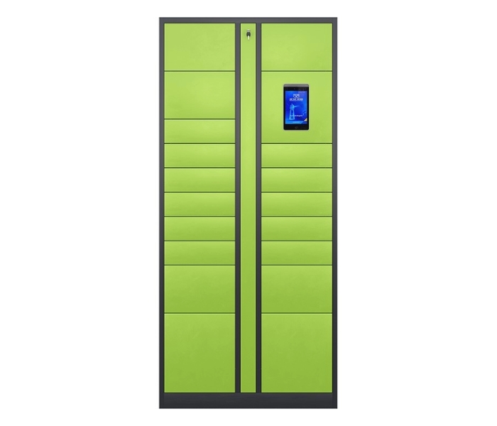 Kiểu dáng: Tủ cố định gồm 3 khoang với nhiều loại ô (nhỏ, vừa, to) và khoang kỹ thuật ở giữa. Sử dụng hệ thống khóa thông minh với các chế độ bảo mật bằng Face ID (nhận diện khuôn mặt) và Mật mã (Pin).