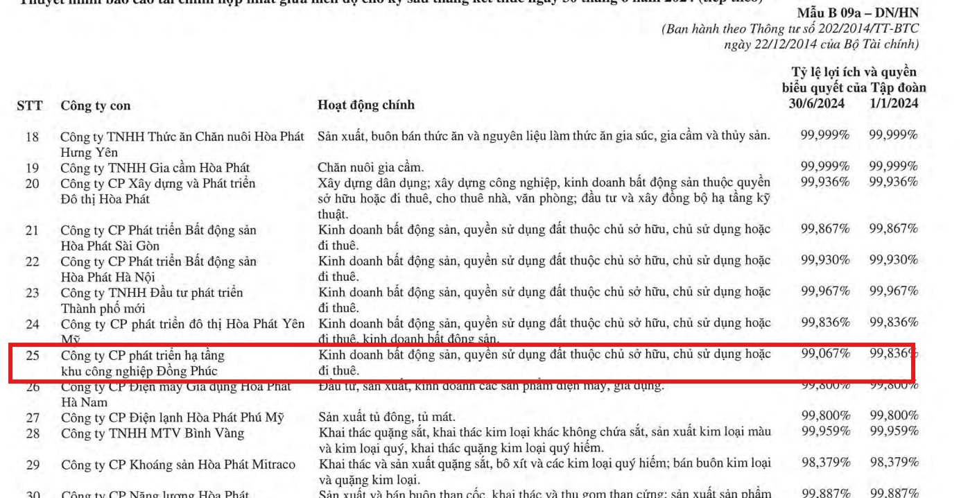 Theo báo cáo tài chính bán niên năm 2024 đã soát xét của Tập đoàn Hòa Phát, tỷ lệ lợi ích và quyền biểu quyết của Tập đoàn tại CTCP phát triển hạ tầng khu công nghiệp Đồng Phúc là 99,067%.