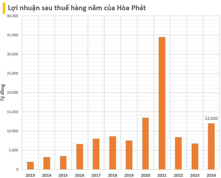 Lũy kế cả năm 2024, Hòa Phát đạt 140.560 tỷ đồng doanh thu, tăng 17% so với cùng kỳ năm trước, đạt kế hoạch năm 2024. Lợi nhuận sau thuế đạt 12.020 tỷ đồng, tăng 77% so với năm 2023 và vượt 20% kế hoạch năm. Năm 2024, Hòa Phát nộp vào ngân sách Nhà nước hơn 13.400 tỷ đồng.